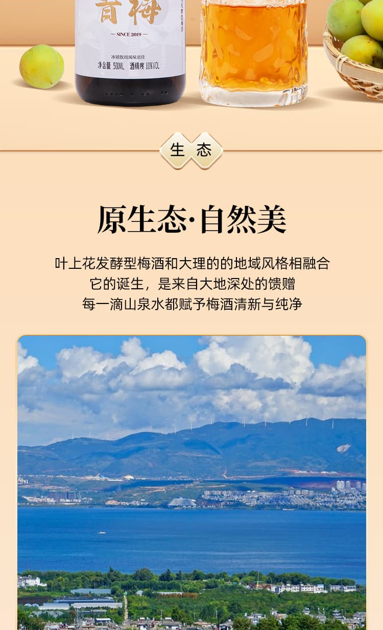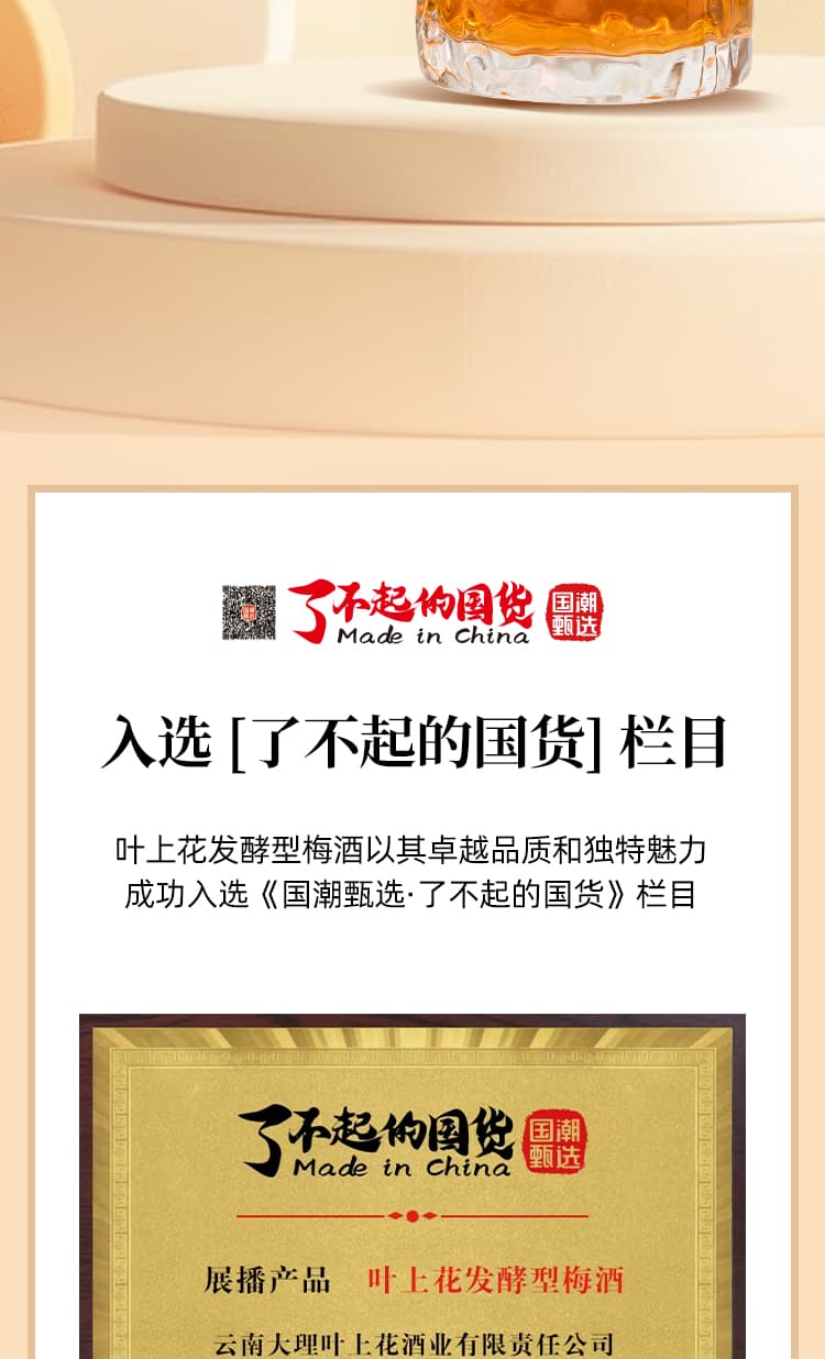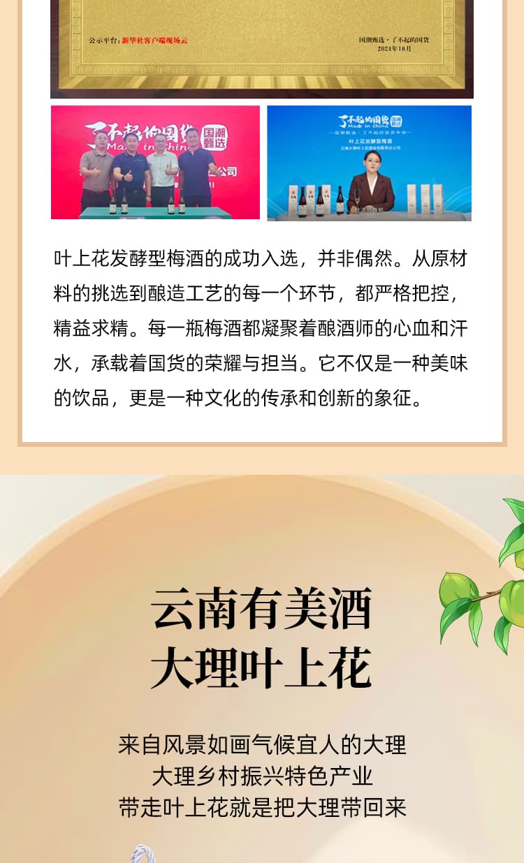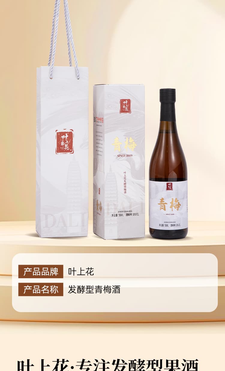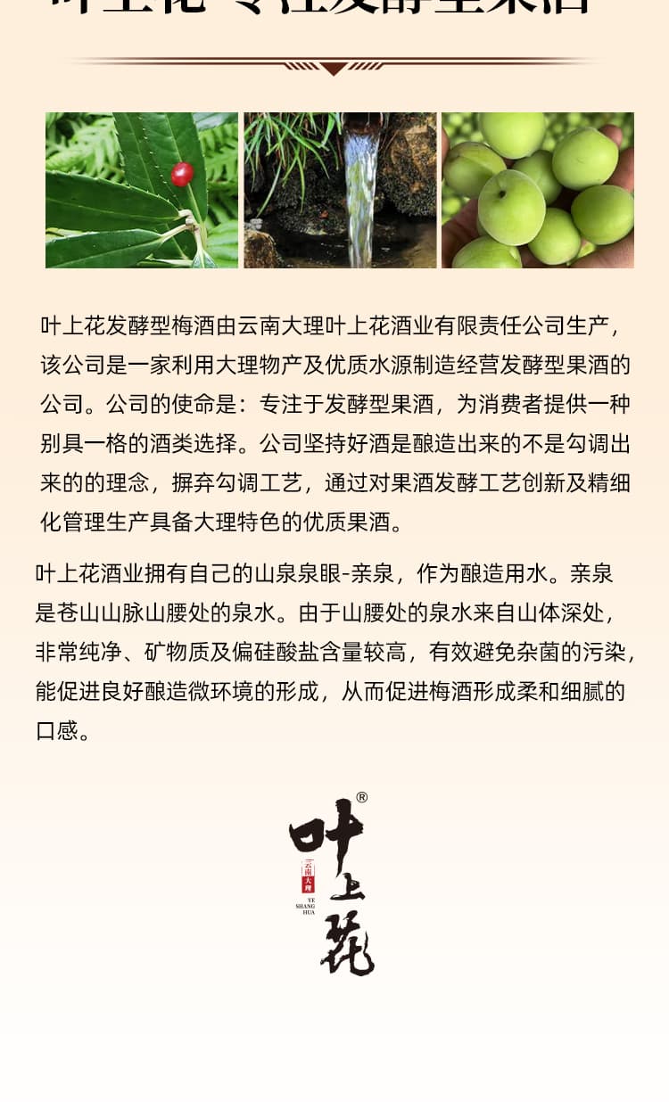 叶上花青梅酒使用洱源原生态青梅和优质山泉水为原料,通过控温发酵工艺酿造而成,叶上花青梅酒梅香味浓郁持久,口感酸甜净爽、柔和细腻。