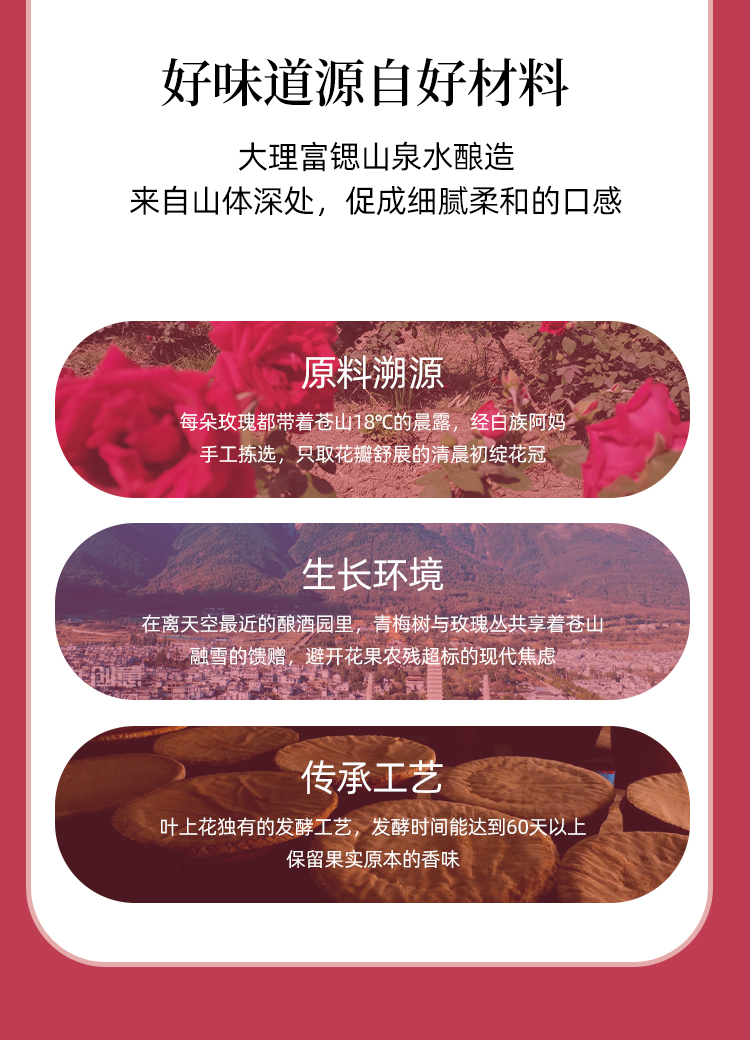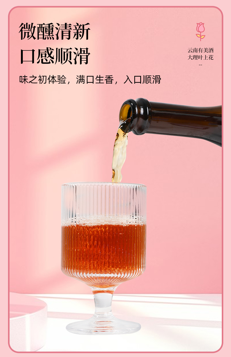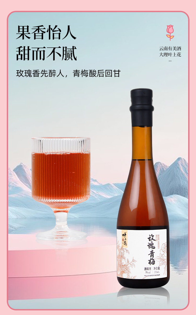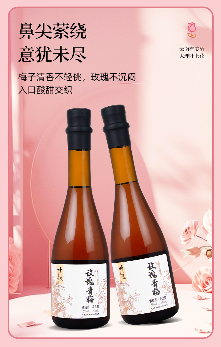 叶上花玫瑰梅酒使用洱源原生态青梅和优质山泉水为原料,通过控温发酵工艺酿造而成,叶上花玫瑰酒梅香味浓郁持久,口感酸甜净爽、柔和细腻。