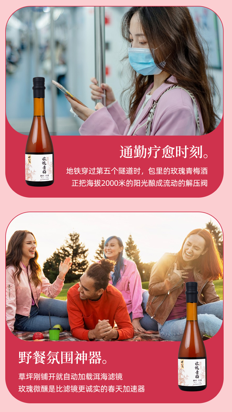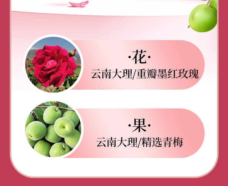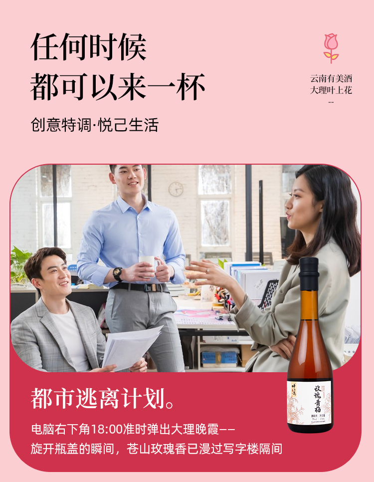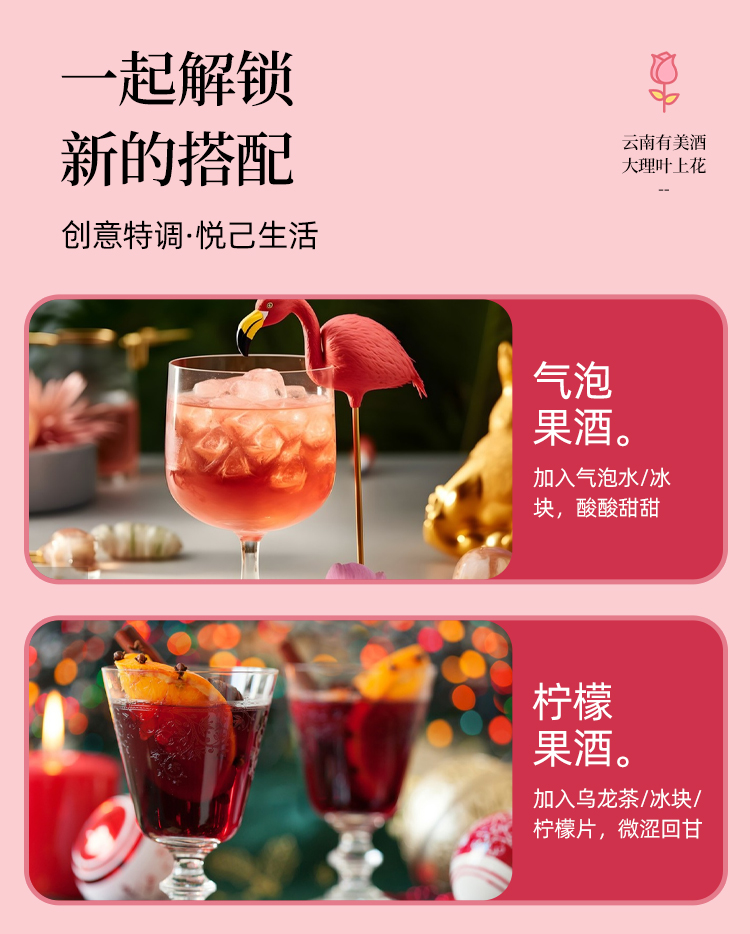 叶上花玫瑰梅酒使用洱源原生态青梅和优质山泉水为原料,通过控温发酵工艺酿造而成,叶上花玫瑰酒梅香味浓郁持久,口感酸甜净爽、柔和细腻。